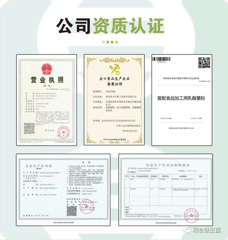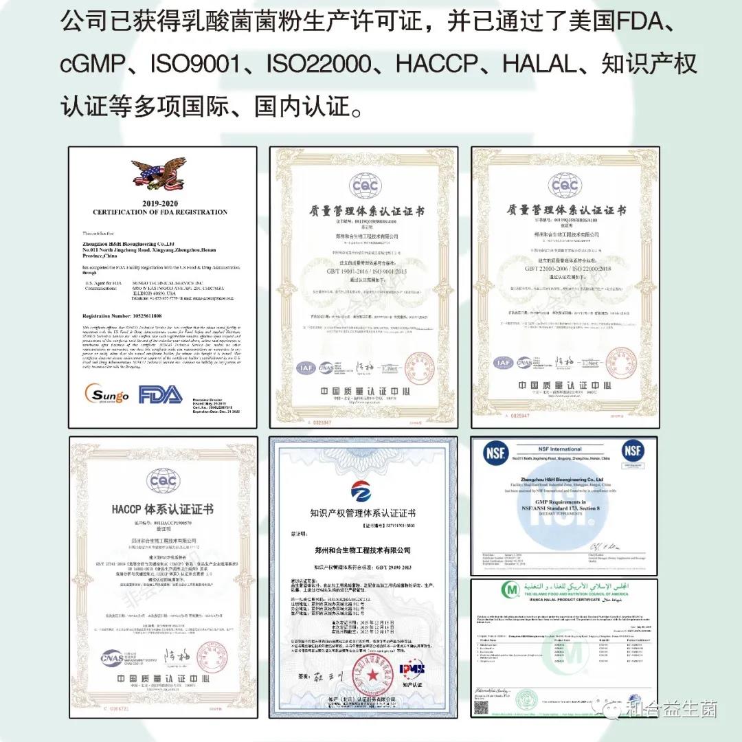 郑州和合生物工程技术有限公司创立于2017年,是一家专注于益生菌研发及产业化的高新技术企业。目前已建成年产30吨高活性益生菌冻干菌粉及其衍生产品的生产基地,是河南地区第一家具备乳酸菌菌粉生产资质和益生菌全端产业链生产能力的公司。公司已获ISO9001质量管理体系,HACCP、ISO22000食品安全管理体系、知识产权管理体系、HALAL、美国FDA认证。